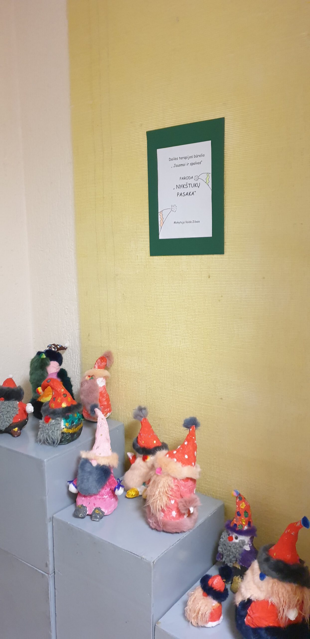 Moksleivių namuose vyksta dailės terapijos būrelio” Jausmai ir spalvos” žaismingų nykštukų, kuriuos vaikai kūrė su šventine nuotaika, paroda. Gipsas, dažai, kailis, tai tik priemonės, kurios buvo panaudotos. Tačiau vaikų kruopštumas, išradingumas, kūrybiškumas suteikė nykštukams išskirtinio žavesio.